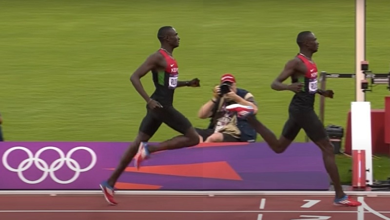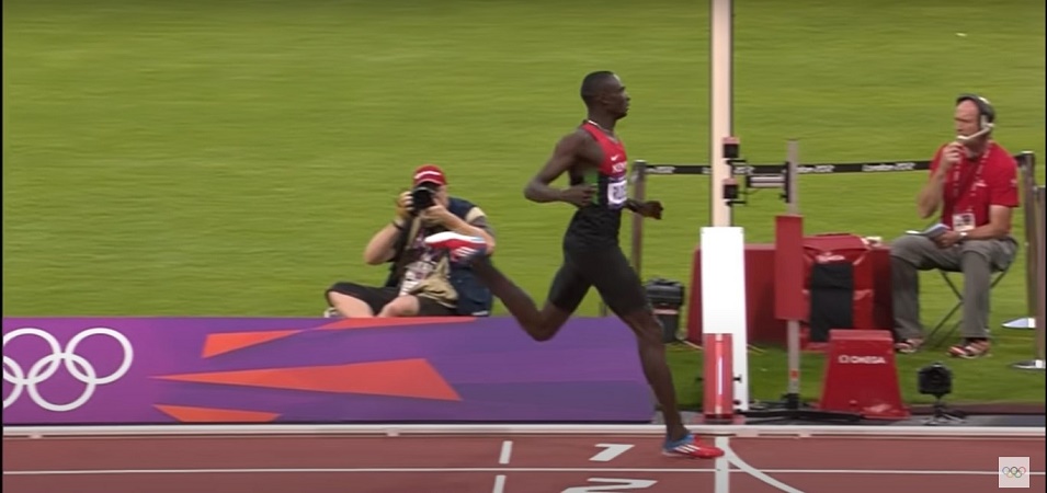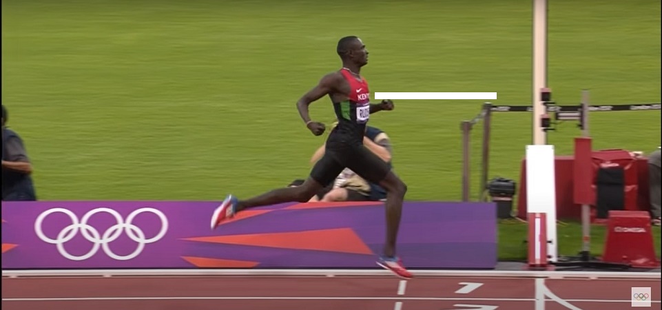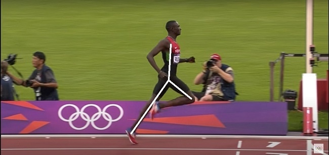 We also see David Rudisha is extending his leg behind him to the point where only his toes are still in contact with the ground. His back leg is straight from hip to ankle as it transfers force to the ground. His ankle is still a little flexed but having looked at multiple pictures and video, it doesn’t appear Rudisha can fully straighten at the ankle which would be better. The key point to notice is that his leg is extending behind his body which is due to a powerful hip extension. To run forward, he has pushed the ground away behind him.