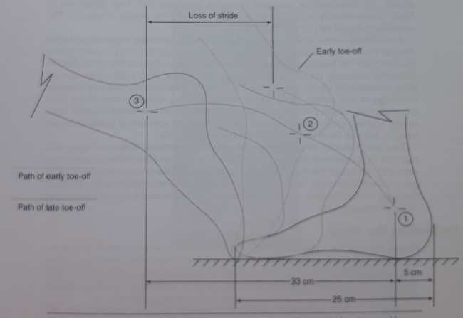 As the yellow arrows show his leg will swing backwards with the foot hitting the ground just ahead of his body. He will continue to propel his leg backwards and his foot will momentarily be stationary on the ground as his body passes over it, just like a pole vaulter arcs over the planted pole. As best possible, his leg will remain straight all the way through to the toe-off. Typically the quicker the running speed, the stiffer the landing leg tends to be.