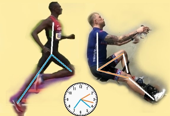 It’s clear from this picture that the legs of the cyclist are always in front of him. There may be some pelvic tilt in his seating to achieve a better aerodynamic position but it’s not enough to be relevant. The position of the saddle, the pedals and cranks ensure his thighs and feet only move in a limited range – the equivalent of 2 – 3:30pm on a clock face. By comparison, Rudisha’s legs are working from about 4:30 – 7pm. The ranges of motion don’t even overlap.