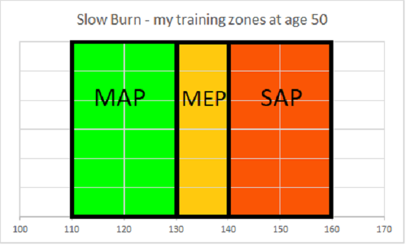 Nonetheless it breaks training into three zones termed Mostly Aerobic Pace (MAP), Mostly Efficient Pace (MEP), Speedy Anaerobic Pace (SAP). The top of the MEP is 180-age, the bottom is 10 beats lower. The MAP zone is the 20 beats below the MEP zone. The SAP zone is the 20 beats above it.  Like the Maffetone formula, you are then allowed some adjustments depending on your experience and health. Finally Mittleman says to fine tune the zones based on how you feel in them. This final step seems to undo the point of using the formula.