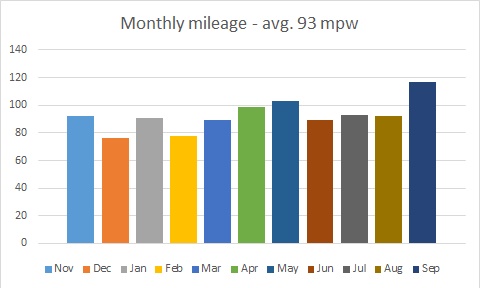 I looked back at his run training over the past year and he’s totalled 1,219 miles. Here’s the monthly totals from November to September, notably there’s only two months where he exceeded 100 miles.