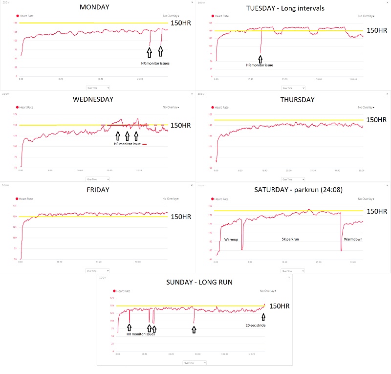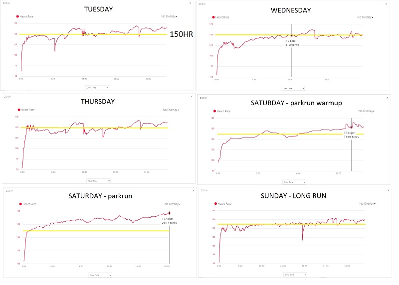 I’ve put a yellow line to indicate where a heart-rate of 150 occurs and you can see that on every run he is reaching and surpassing it for a decent portion of the time. In fact, at parkrun the heart-rate reaches 170+ and most days he’ll be hitting the 160s at some stage of the running. He’s not just exceeding 150bpm but exceeding it significantly on almost every run.