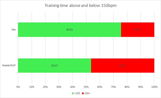 One hundred and fifty is close to where my lactate threshold heart-rate usually lies and I calculate I have a 76-24% split above and below it. That’s within the bounds of 80-20 training. On the other hand, the Needs MAF runner’s training split comes in at 54-46%. It begins to explain why he’s failing to make progress and getting injured when he starts to do even more intense work!