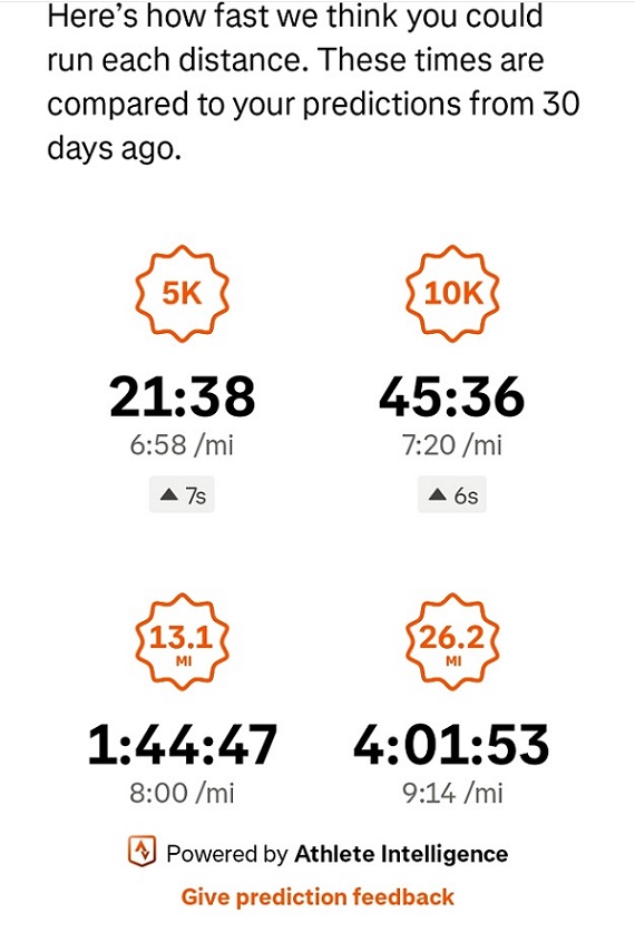 Strava recently gave me a month’s free premium membership and they seem to have embraced AI with gusto. Among the features is its willingness to Predict Race Times. Despite having the perfect info available – weekly 5K – Strava is reckoning I can run over a minute faster. Clearly I can’t unless I change my training and then their prediction will probably change.