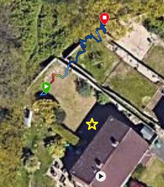 The answer is I was skipping on the same spot for a minute or so. The Yellow star marks where I was yet you’d never know it from what you see. It looks like I’ve started at the top of the garden, gone over the fence and ended up a couple of doors down. It provides a good example of how inaccurate GPS can be. Not only do I appear to move, but the trail never even touches where I was actually skipping.